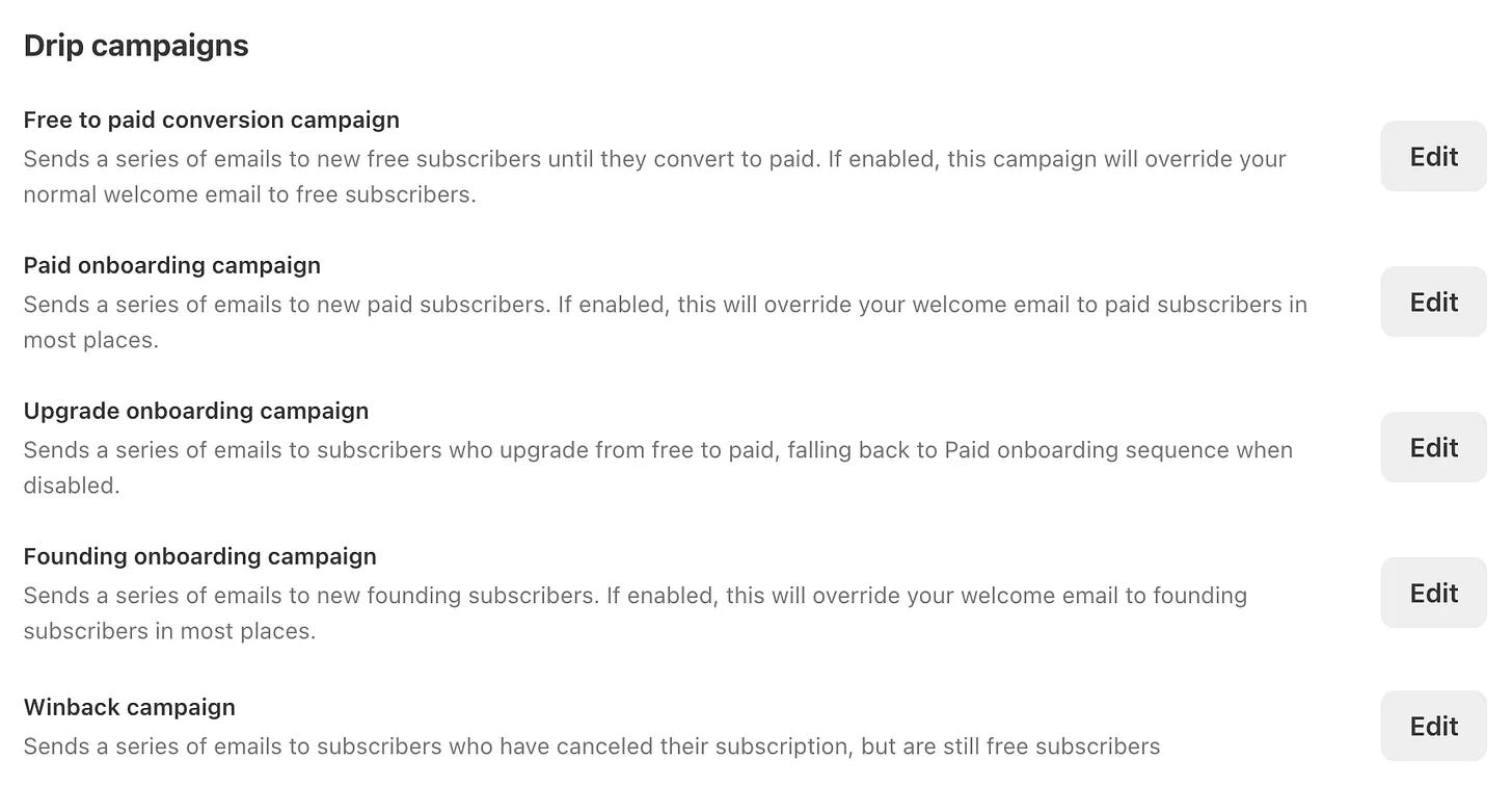 Now, Substack is testing automated email sequences currently. You can check if you qualify by going to your Dashboard → Settings → Email and looking for Drip Campaigns: