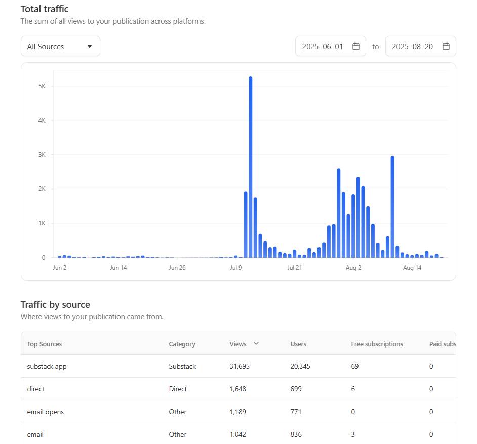 I wrote my first Substack post on June 2nd, 2025. I didn’t really put much effort until July. In just over a month, Substack delivered over 35,000 views to my content: