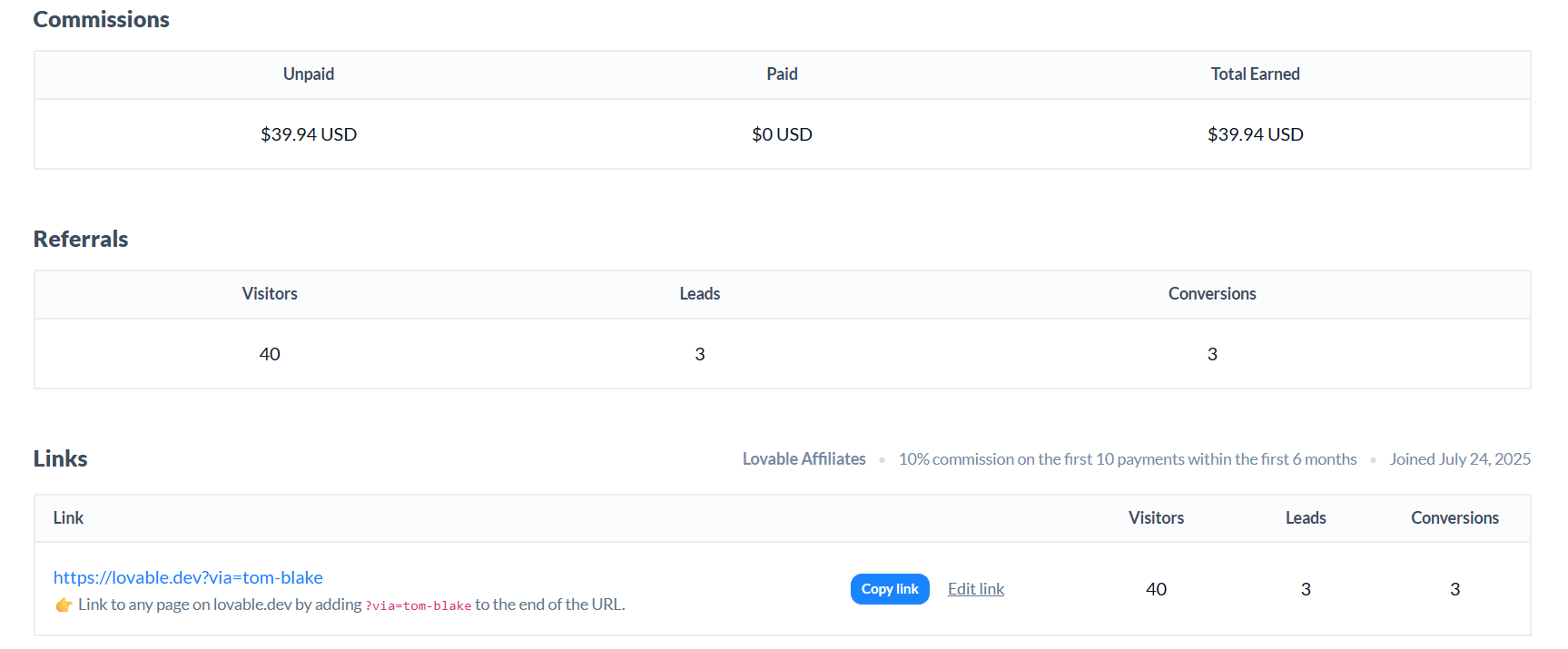 I actually use Lovable, so I plugged affiliate links in the article. Since then, it’s earned almost $40 from 3 conversions: